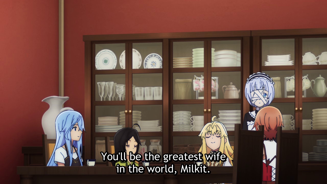В плюсы ещё добавлю намёки на реализм: когда Хадзиме пытается пристроить сиротинушку в приют ему священница прямым текстом выдаёт, что девчушка не с их поселения, а значит никто её брать не станет - своих голодных ртов навалом, а то что он обещает помочь мясом, ну так дети - не волчата, им не только еда нужна, но и одежда, лекарства (когда заболеют), посуда, постельное бельё, книги и много ещё чего.