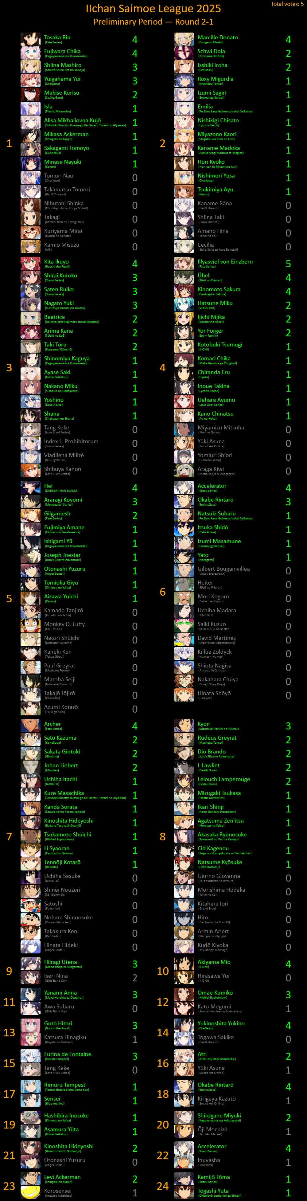 Arena 5 [[Emiya Shirō]] Namikaze Minato [[Yagami Light]] [[Saitama]] Totsuka Saika Nishikata [[Ajiro Shinpei]] Nobi Nobita Denji Ishigami Senkū Amamiya Ren Kurosaki Ichigo Otto Suwen Fukube Satoshi Bell Cranel [[Char Aznable]] Yamada Akito