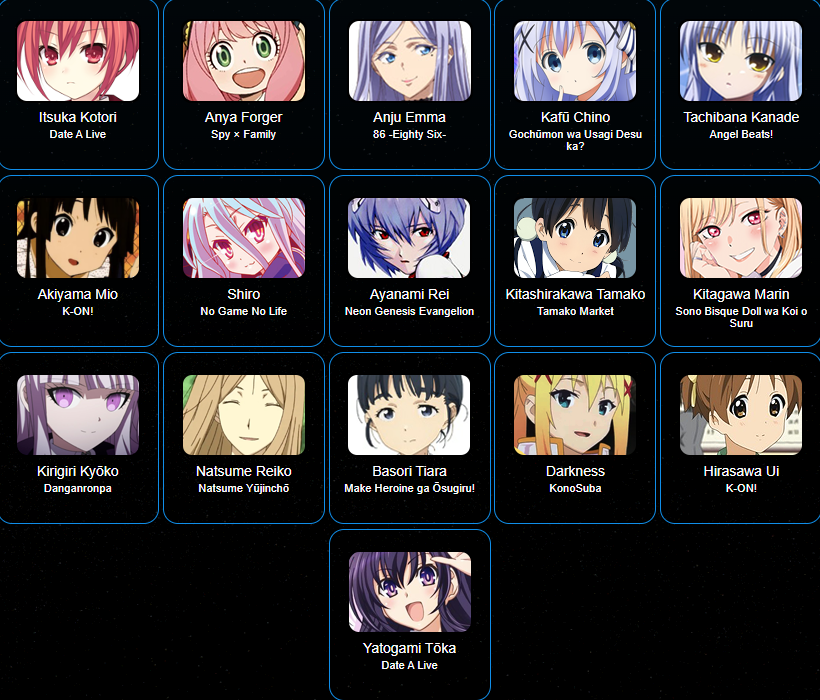 Arena 1 [[Shiro]] Akiyama Mio Hirasawa Ui Kitagawa Marin [[Tachibana Kanade]] Kitashirakawa Tamako Anya Forger [[Itsuka Kotori]] Basori Tiara Ayanami Rei [[Yatogami Tōka]] Natsume Reiko Kirigiri Kyōko [[Kafū Chino]] Darkness Anju Emma