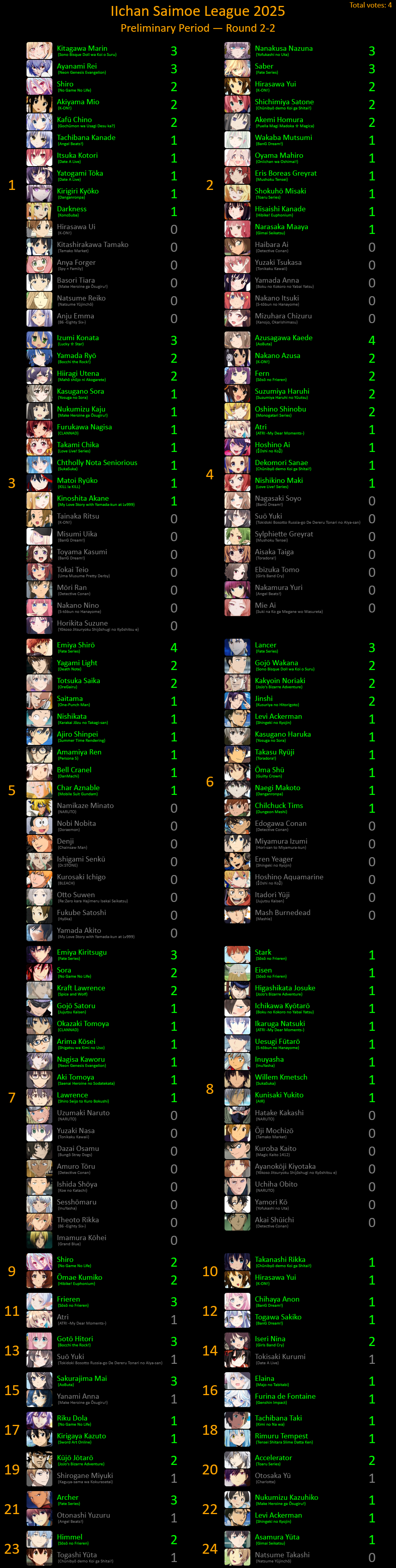 Арены Mio vs. Yui и Bocchi vs. Hinagiku вызвали достаточно сомнений, но групповые выборы оказываются даже больнее непосредственных противостояний. Особенно больно было выбирать в Sakura vs. Takina vs. Eru vs. Asuna, в Shana vs. Yuki vs. Kuroko и в Yui vs. Rin vs. Misuzu.