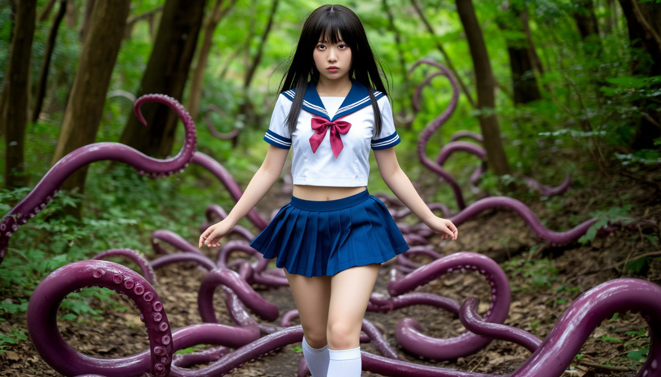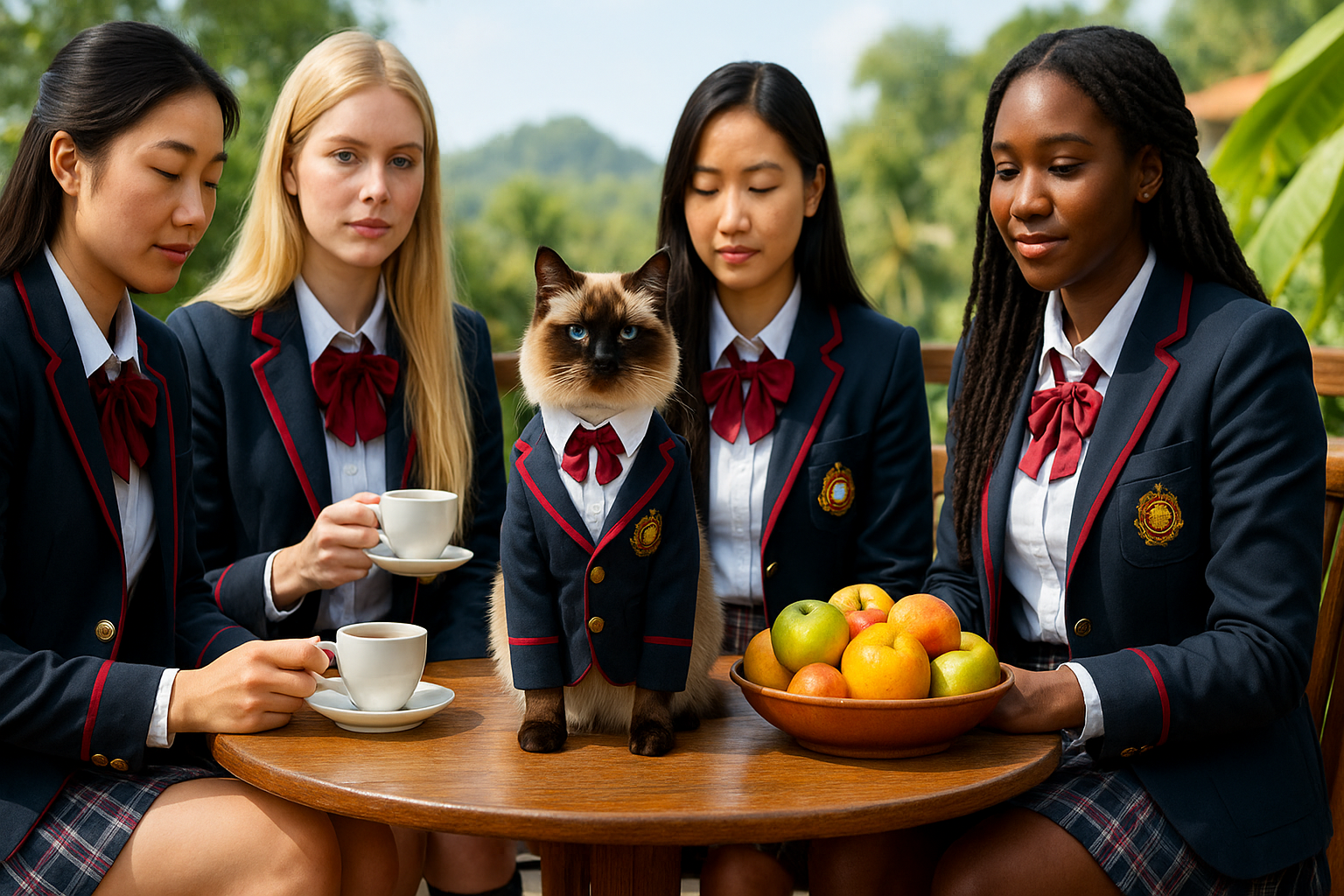 Кот под столом был добавлен в текстовый запрос, чтобы в кадр попало очевидное нарушение правил учебного заведения. Насколько мне известно, запрет на подобные действия с униформой существует во всех хороших учебных заведениях развитых азиатских стран, но вне территории учебного заведения это мало кого останавливает.