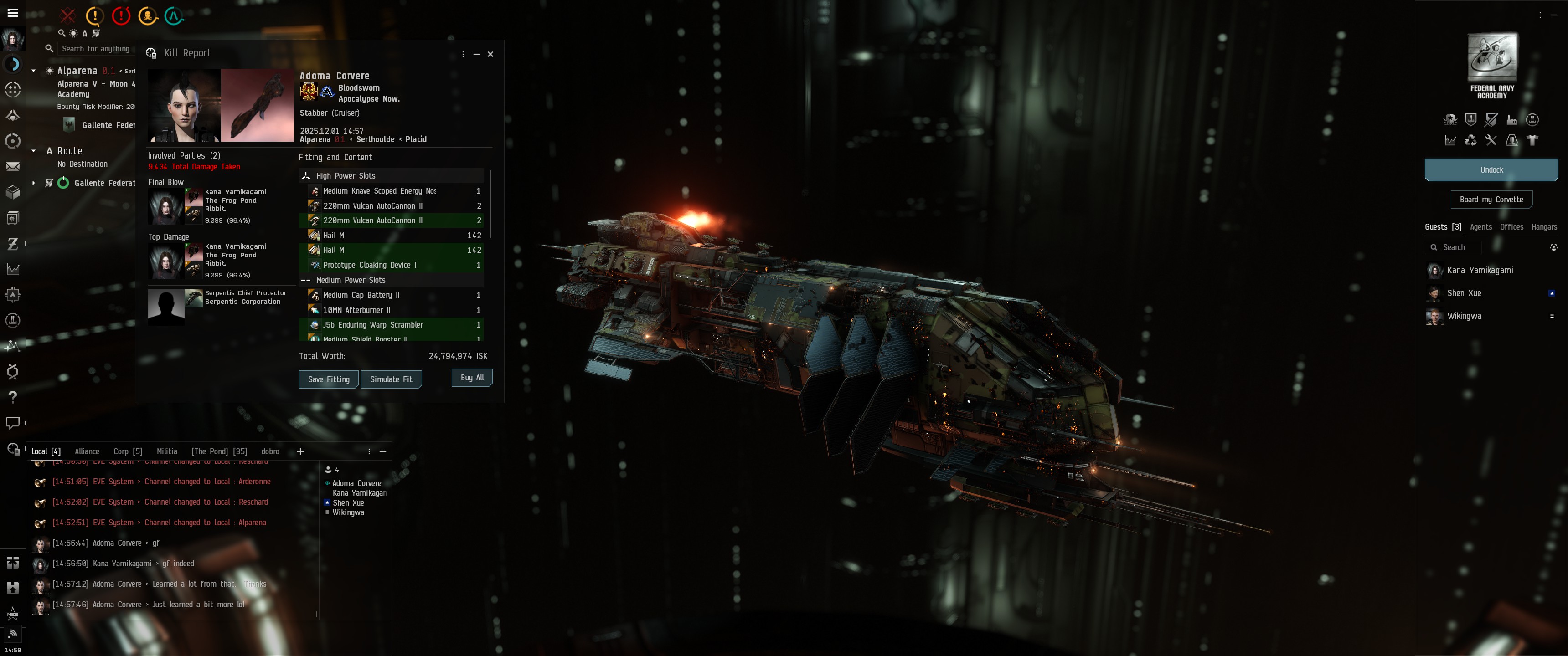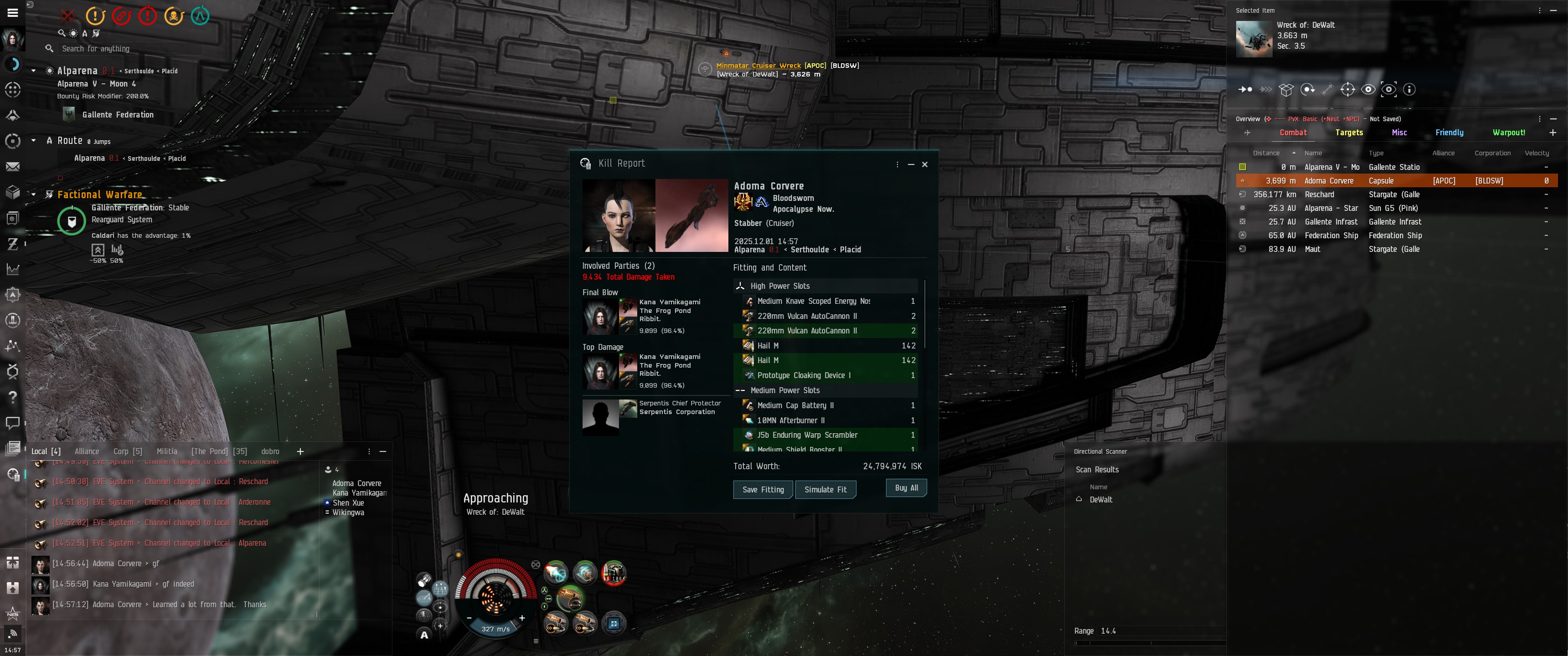 Приварпываю, тот в 20км. Зарядил Barrage, скрипт на оптимал и начал орбитить в 20км на МВД. Стаббер выплёвывает дронов - 3 Warrior II, 2 SW-300. Отстреливаю сеткующих, добиваю лёгких. Стаббер начинает попадать, я падаю на армор (у меня шилд-танк, есичо), бью стаббер и вытапливаю на орбиту 19-20км. Тот быстро начинает умирать, но и я на 1/3 армора. Стреляю, стреляю, грею пушки, а тот - бац - и вытапливает за 24км. 25, 26км, потом улетает на станцию в агре. Я за ним, заряжаю Hail, прилетаю в 0 к нему, добиваю в греве.
