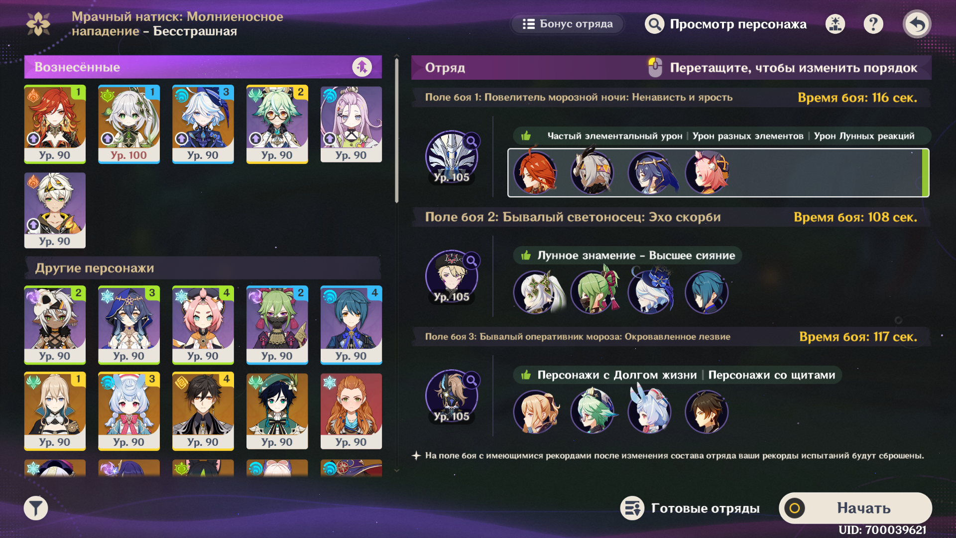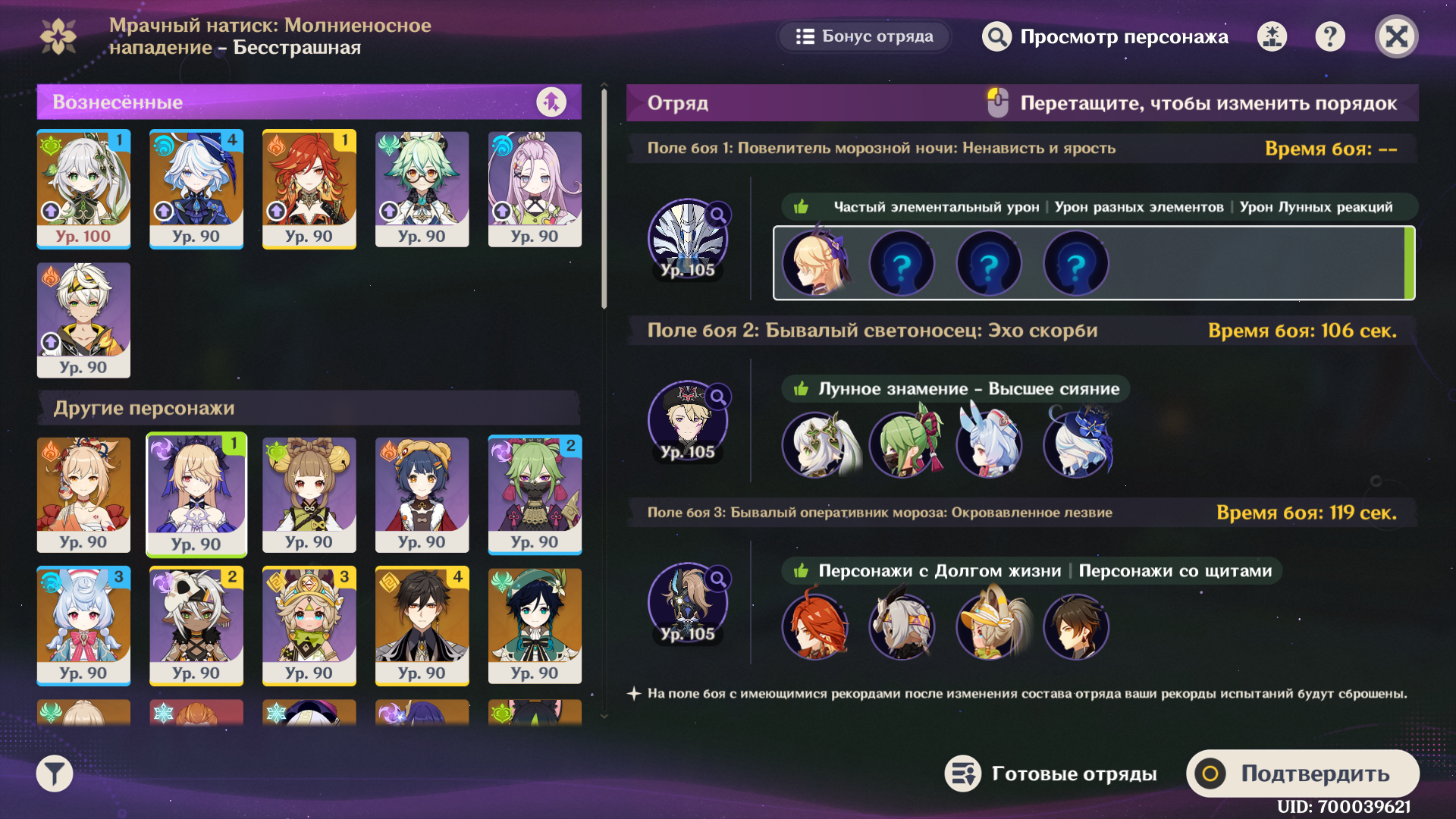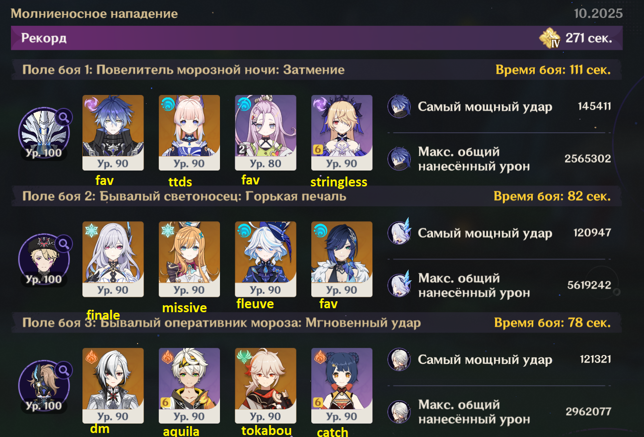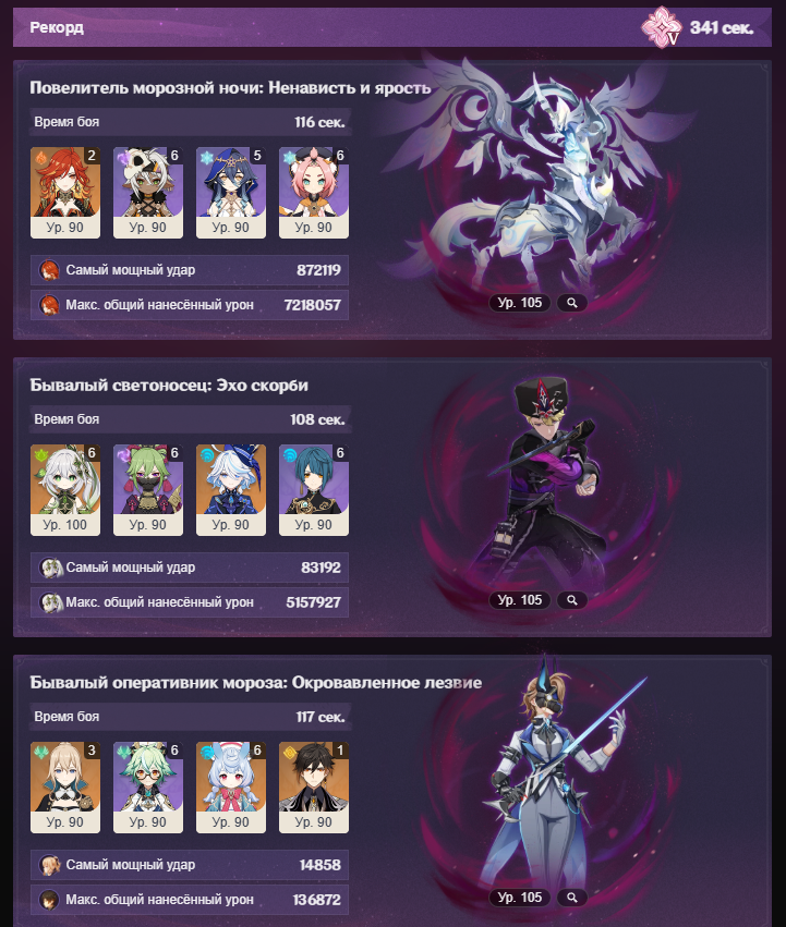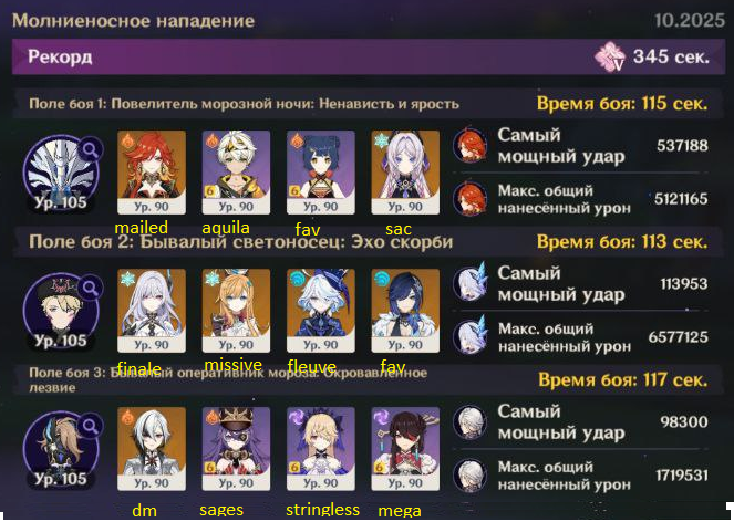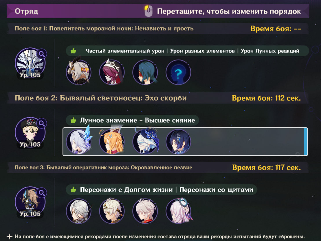 Короче, этот олень с Нефер и пересобраной Айно проходится, но даже у нее ротации с извратом, типа того, что на первом щите сначала прожимаешь кнопки и даешь один чарж, а потом бегаешь в ожидании второй ешки и зарядки ульты Айно, не делая больше ничего, иначе легко случайно залочить дендро. И без сигны Нефер все еще не может догнать Мавуику c2r1 с дедом (с этой командой тоже нужно повертеться, выпуская определенных персонажей на поле в определенный момент и внеся ровно столько урона, чтобы хватило на одну ульту Мавы после второго щита). Думаю, что боссы балансируются только на 4 сложности для большинства и на 6 для китов, а на остальных все абы как, поэтому с пятой такая ерунда и так все криво даже для целевой команды, приходится изобретать какую-то хрень.