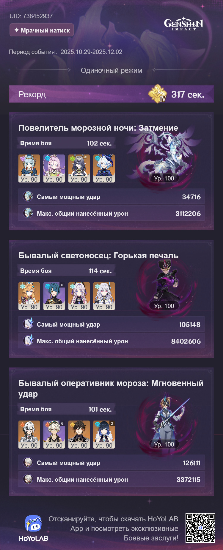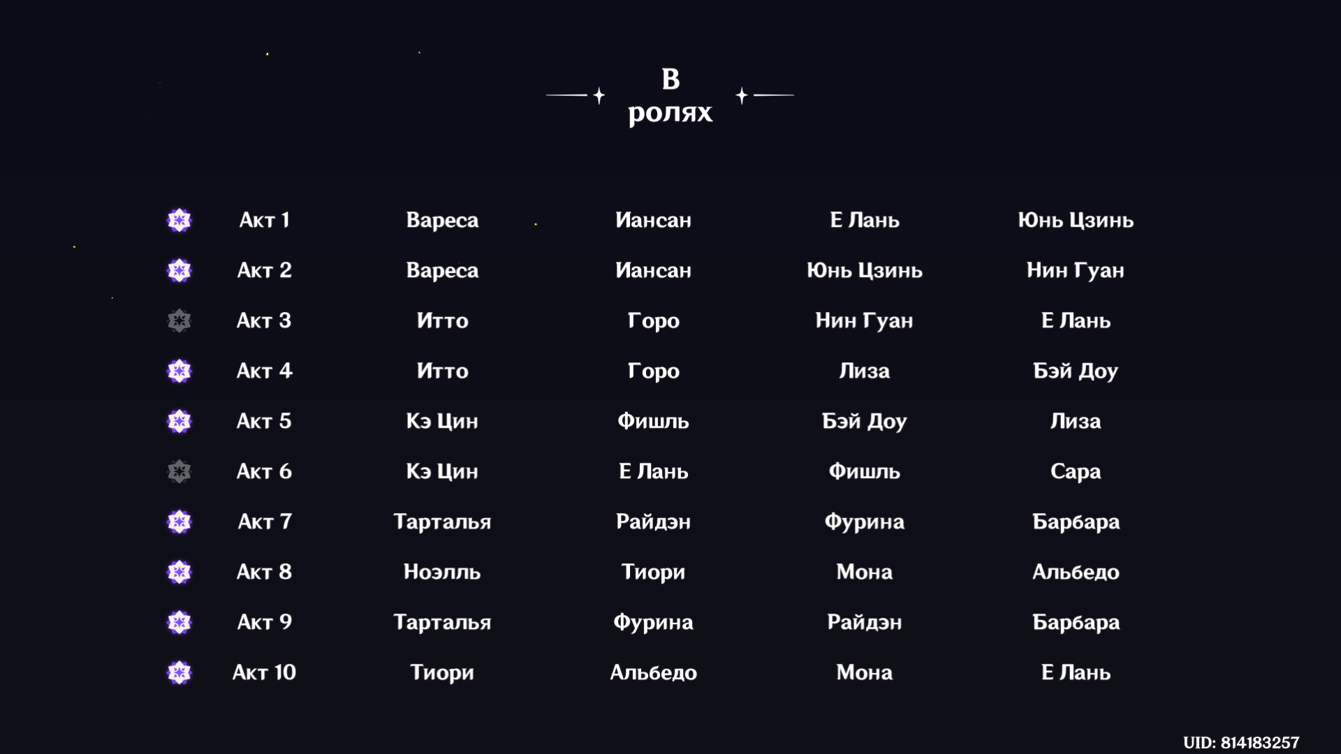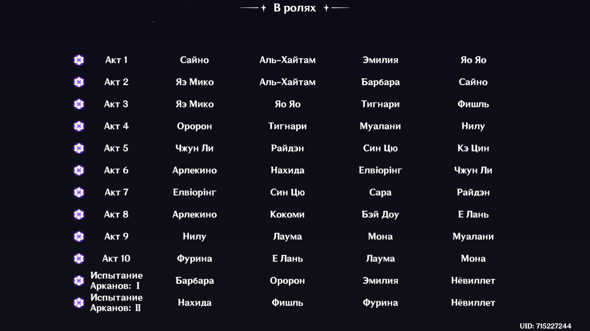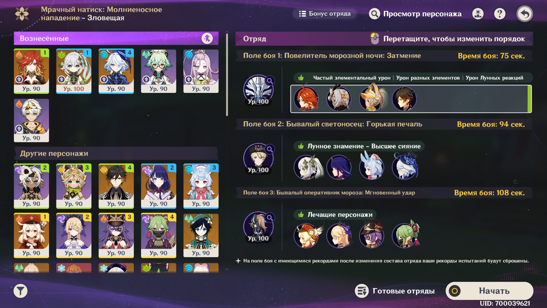 Короче, этот олень с Нефер и пересобраной Айно проходится, но даже у нее ротации с извратом, типа того, что на первом щите сначала прожимаешь кнопки и даешь один чарж, а потом бегаешь в ожидании второй ешки и зарядки ульты Айно, не делая больше ничего, иначе легко случайно залочить дендро. И без сигны Нефер все еще не может догнать Мавуику c2r1 с дедом (с этой командой тоже нужно повертеться, выпуская определенных персонажей на поле в определенный момент и внеся ровно столько урона, чтобы хватило на одну ульту Мавы после второго щита). Думаю, что боссы балансируются только на 4 сложности для большинства и на 6 для китов, а на остальных все абы как, поэтому с пятой такая ерунда и так все криво даже для целевой команды, приходится изобретать какую-то хрень.